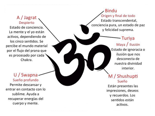 omkara (‘sílaba om’) aum (análisis de la letra o, que en el idioma sánscrito generalmente es la conjunción de las letras a y u) ॐ en silabario devánagari.